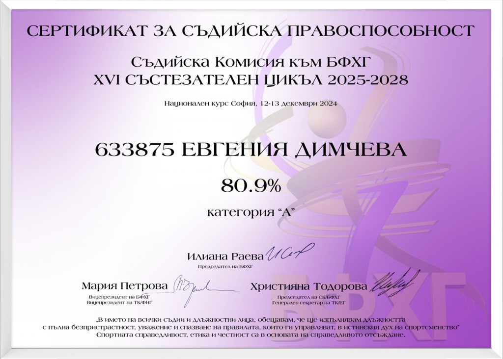 Допълнителни сертификати за завършени курсове към Българска федерация по художествена гимнастика, сред които: