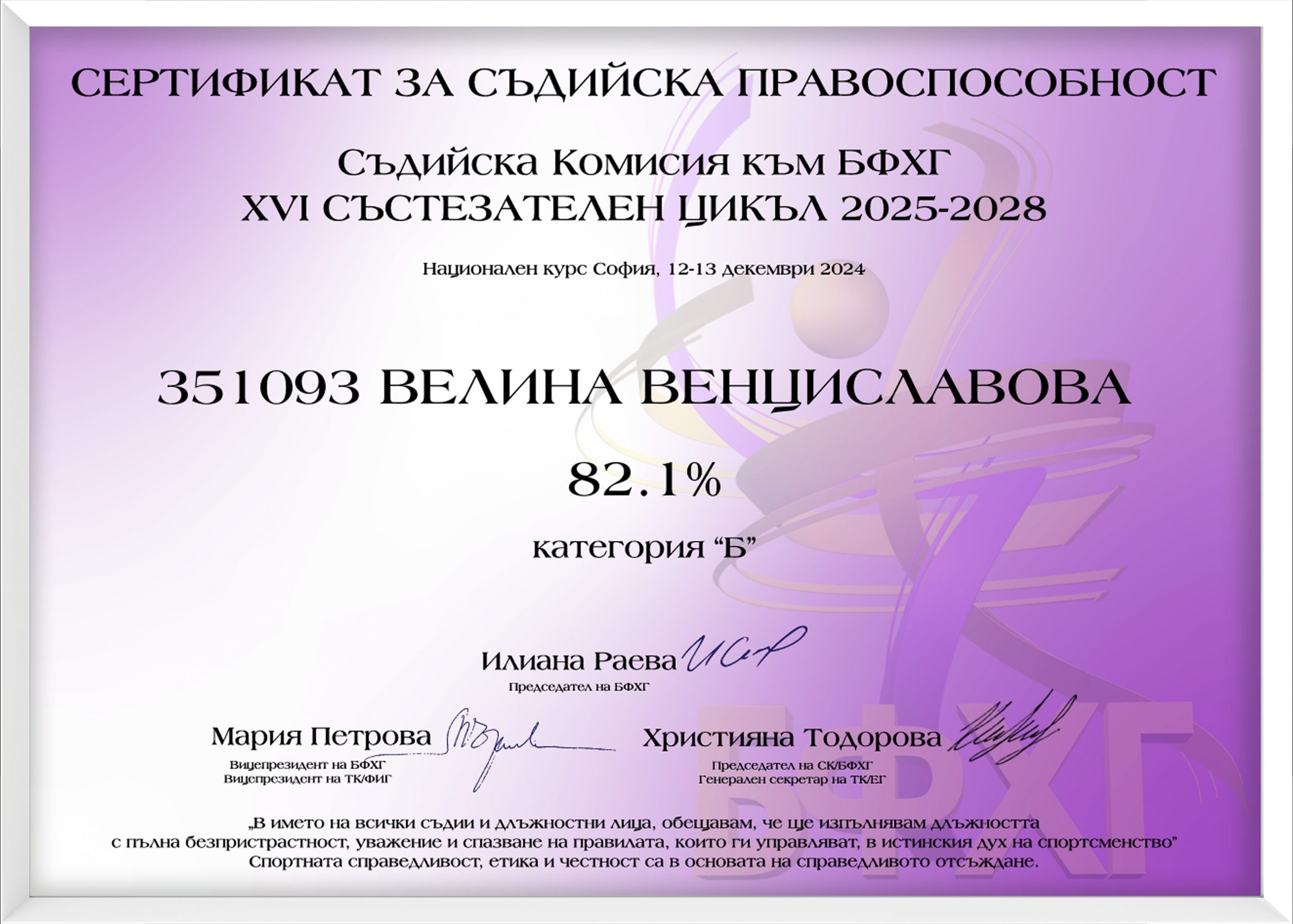 - Сертифициран съдия към БФХГ от 2024 г., категория „Б“ с резултат от 82.1%