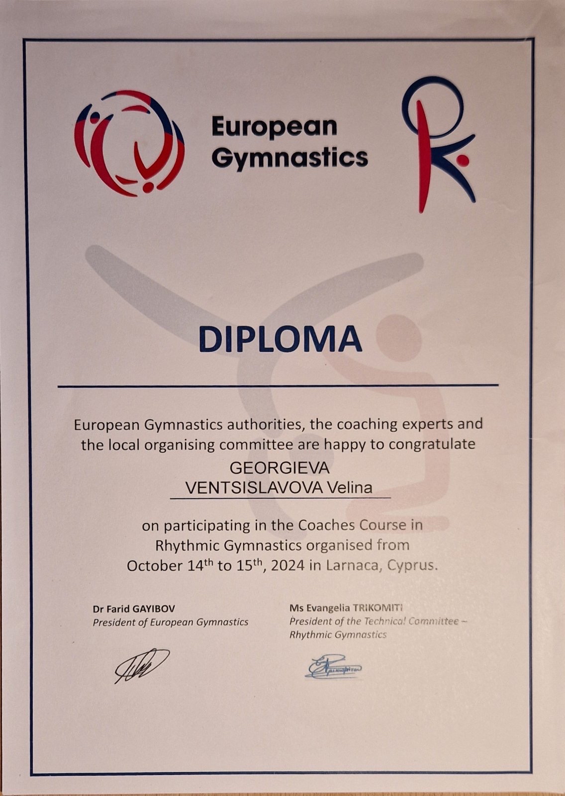 - Треньорски курс във връзка с новия правилник 2025-2028г. в Ларнака /Кипър/ от Техническия комитет по художествена гимнастика към Европейската гимнастика и Кипърската федерация